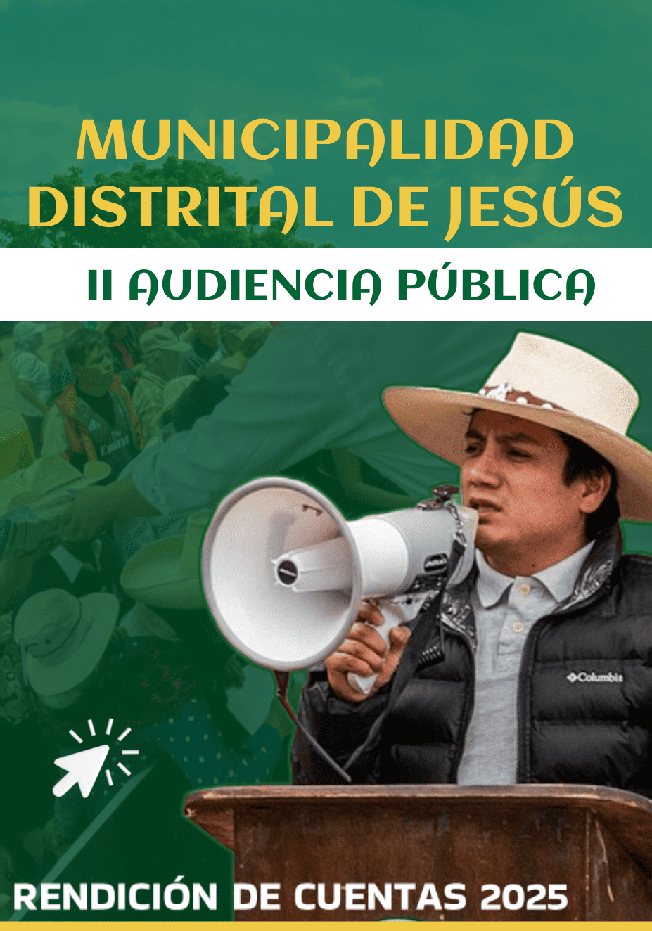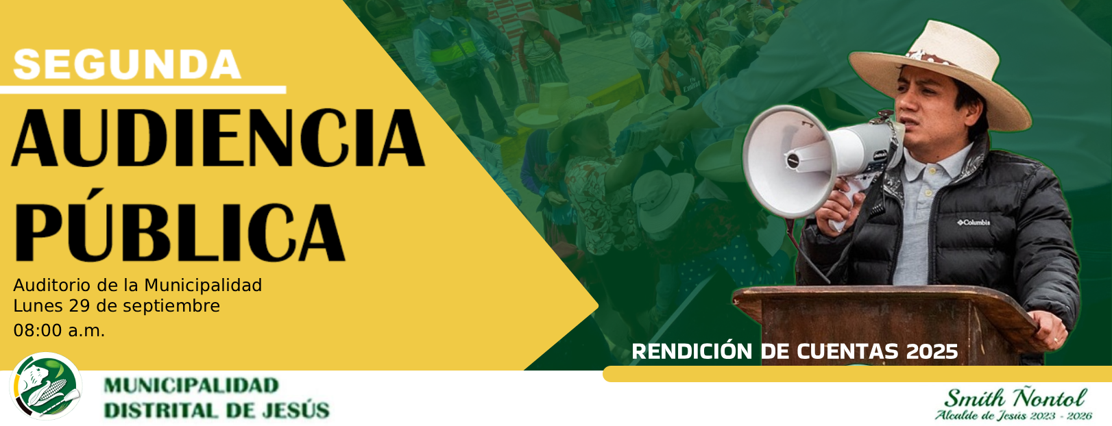 Domingo, 28 Septiembre 2025 22:43La Municipalidad Distrital de Jesús tiene el agrado de invitar a la población en general a la presentación de la ll audiencia publica 2025. 𝐅𝐞𝐜𝐡𝐚: lunes 29 de septiembre 𝐇𝐨𝐫𝐚 : 08:00 a.m. 𝐋𝐮𝐠𝐚𝐫:...